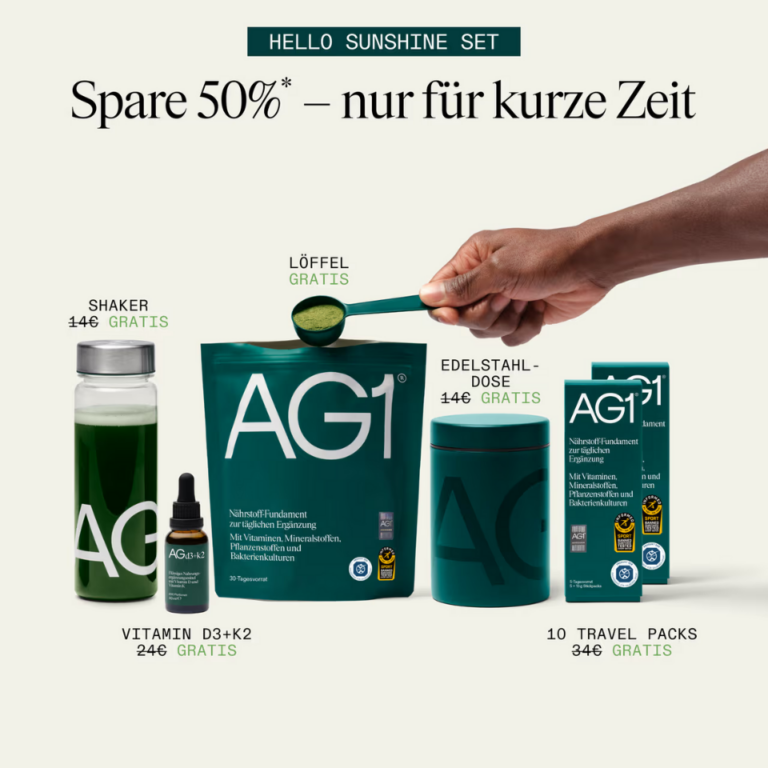 GRATIS: Vitamin D3+K2, 10 Travel Packs & AG1 Willkommens-Kit – 50% Preisvorteil.